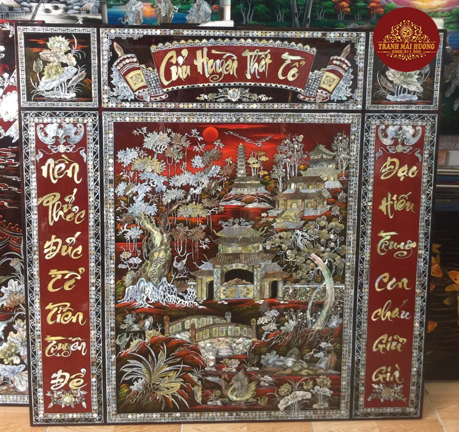 Tranh sơn mài “Cửu Huyền Thất Tổ” không chỉ là một tác phẩm nghệ thuật mà còn mang giá trị tâm linh sâu sắc, thể hiện lòng hiếu kính của con cháu đối với tổ tiên. Được chế tác bởi các nghệ nhân tài hoa từ cơ sở Mai Hương, tranh “Cửu Huyền Thất Tổ” là kết tinh của sự khéo léo, kiên nhẫn và kỹ thuật sơn mài điêu luyện, đặc trưng của làng nghề truyền thống.