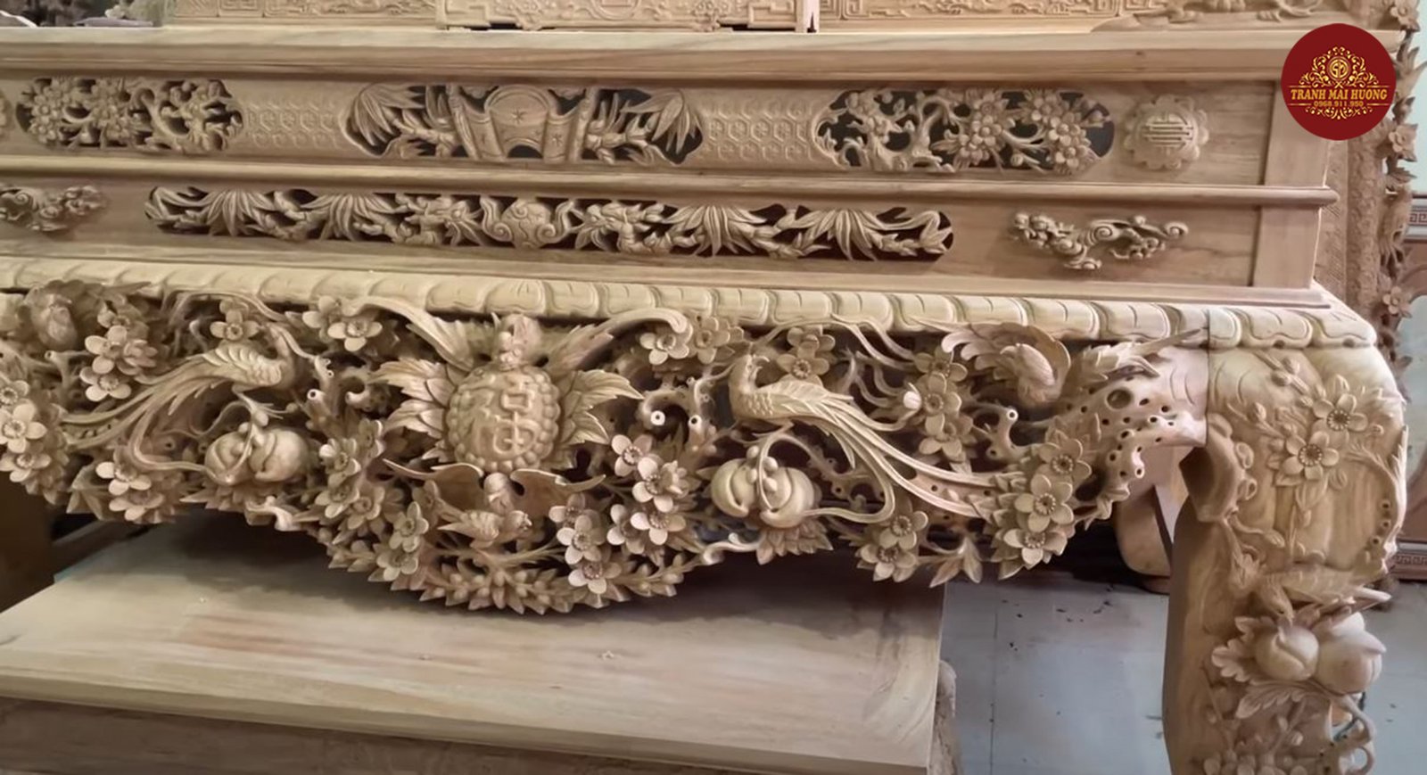 Sập thờ là một trong những mẫu bàn thờ gia tiên đang được rất nhiều gia đình lựa chọn. Loại bàn thờ này khá phù hợp cho không gian thờ cúng với diện tích rộng hoặc sử dụng trong không gian nhà thờ họ. Bởi sự uy nguy và tôn nghiêm của nó mang đến làm tâm điểm, điểm nhấn sâu sắc cho cả ngôi nhà. Một sập thờ giá rẻ thôi cũng đã được làm từ chất liệu gỗ tự nhiên quý hiếm đặt trong không gian thờ toát lên sự tôn nghiêm và linh thiêng. Đây là loại có chiều cao thấp, bốn chân trụ thường to tạo cảm giác vững chãi. Thường thường sẽ được chạm khắc những linh vật xung quanh bốn chân biểu thị cho quyền uy, dũng mãnh và mang ý nghĩa tâm linh rất lớn. Những loại gỗ quý ví dụ như gỗ Mít, gỗ Gụ, gỗ Hương, gỗ Sồi… tùy vào yêu cầu của khách hàng. Nhưng trong các loại gỗ kể trên thì tiêu biểu nhất vẫn là gỗ Mít và gỗ Gụ. tranh gỗ cổ truyền mai hương Theo tín ngưỡng xưa, Hoa Mai là hình ảnh mang đến những điều tốt lành, là sứ giả của mùa xuân, mùa đẹp nhất của một năm trăm hoa đua nở. Hai hình ảnh là nét đẹp truyền thống, là phong tục từ ngàn đời nay truyền lại. Cho nên, sập thờ được chạm khắc những hình ảnh này tạo nên cảm giác thiêng liêng, là vật kết nối tâm linh với con người nơi trần tục. Với sự kết hợp hoàn này giữa các chi tiết mai, điểu cùng với chữ phúc sẽ mang đến cho gia đình bạn những điều tốt lành, sự hạnh phúc, may mắn và trường thọ. Tứ linh có nghĩa là 4 loại vật gồm “Long – Ly – Quy – Phụng”. Bốn loài vật có sức mạnh phi thường và tượng trưng cho bốn yếu chính trong trời đất chính là đất, nước, lửa và gió. Hình ảnh tứ linh được sử dụng phổ biến trong những không gian cổ kính, thờ phụng linh thiêng hay tại nhà thờ họ, nhà thờ gia tiên…Tứ linh biểu hiện cho sự giàu có và quyền lực, đại diện cho hoàng tộc ngày xưa. Sập thờ tứ linh là mẫu sập thờ cao cấp được khắc lên 4 loài vật cao quý này với ý nghĩa của sự may mắn, đại diện về mặt tinh thần của con người trong cuộc sống. Sập Ngũ Phúc Với hình tượng chủ đạo Ngũ Phúc Thọ Dơi – Ngũ Phúc Kim Tiền . Mang ý nghĩa Trường Thọ Phú Quý Và May Mắn cho gia chủ sở hữu. Ngoài Ra các đường nét đục của chạm Sập Ngũ Phúc còn có hình ảnh quả trám . Tượng Trưng cho khí chất của người quân tử . Hơn Nữa ở 2 bên cạnh của chữ Phúc các nghệ nhân đã rất khéo léo. Lồng ghép hình tượng mai điểu mang ý nghĩa sum vầy hạnh phúc sự hoà hợp vợ chồng.
