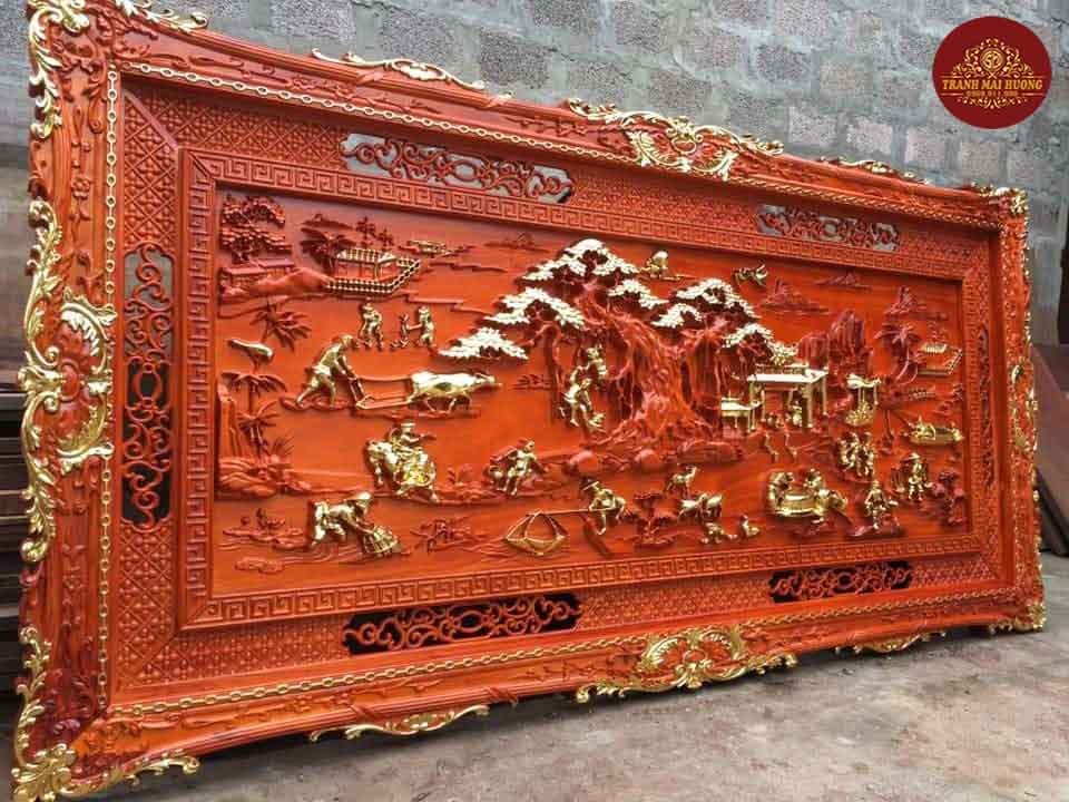 Categories: TRANH GỖ ĐẸP TREO PHÒNG KHÁCH, TRANH GỖ ĐỒNG QUÊ, TRANH GỖ LÀNG NGHỀ Tag: Tranh đồng quê dát vàng gỗ hương